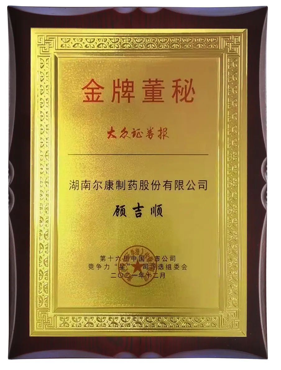 2021年12月26日,以“傳承百年信仰.新起點新征程”為主題的第十六屆“中國上市公司競爭力公信力‘星’公司”評選活動榜單揭曉,爾康制藥榮譽入選2021年度綠色發展“星”公司榜單,公司副總經理、董事會秘書顧吉順當選為金牌董秘。